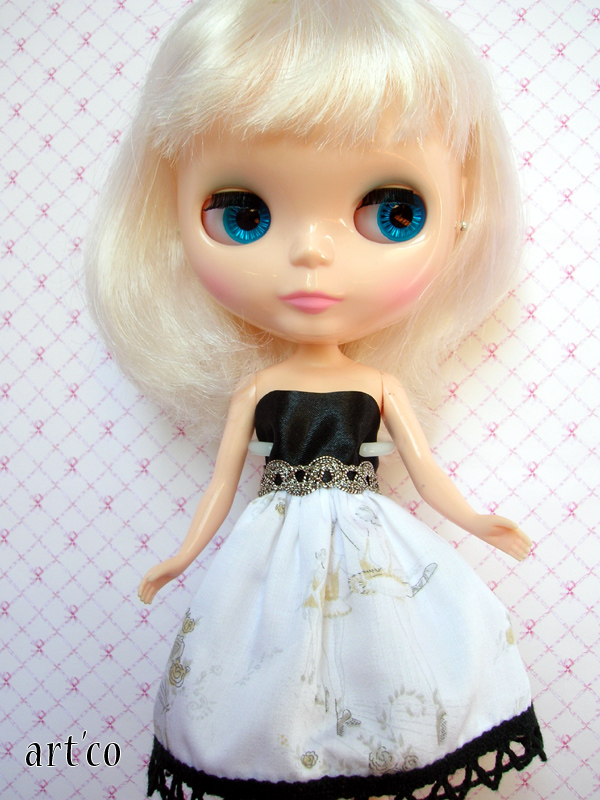 Robe en coton et bustier en satin noir, ceinture argentée, dentelle noir en coton en bas de la robe.